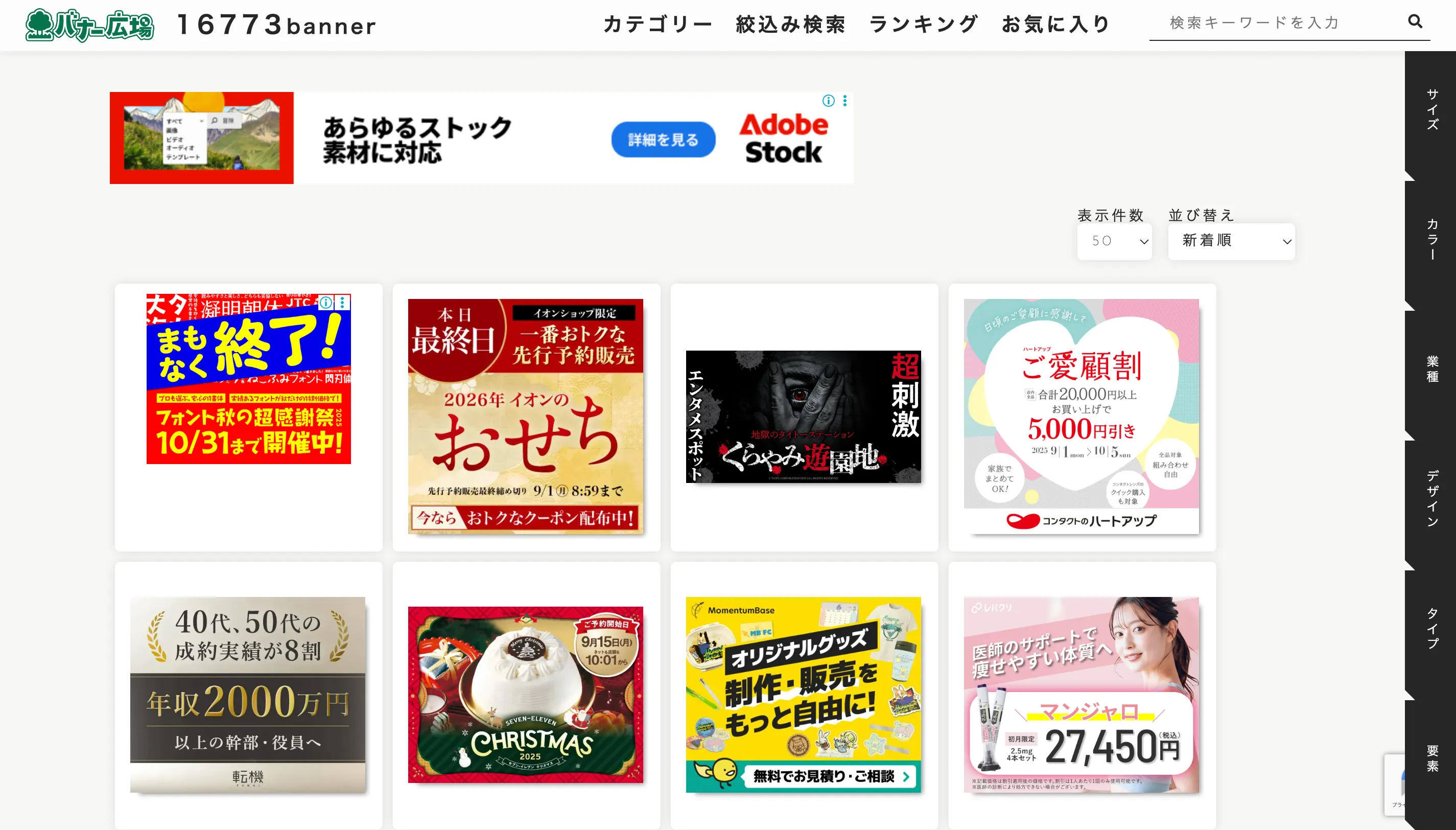 バナー広場 | 掲載数16,000件以上。検索機能が充実し、人気順などの並び替えも可能 |